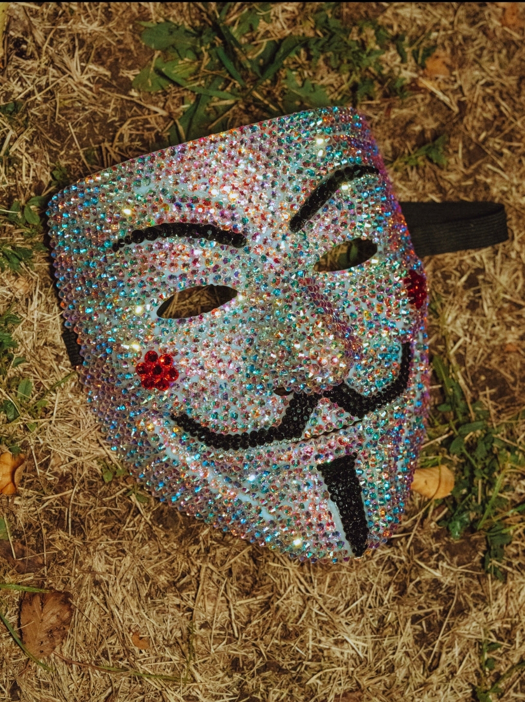 One of a kind crystal mask inspired by V for Vendetta! All rhinestoned by hand.