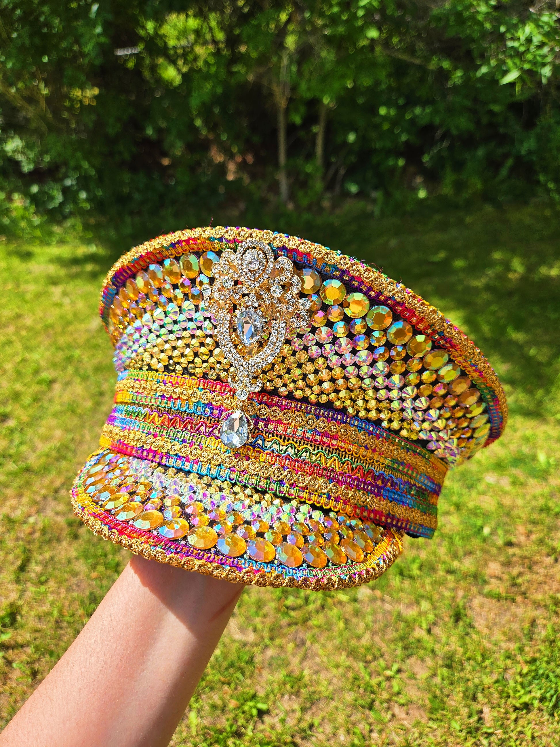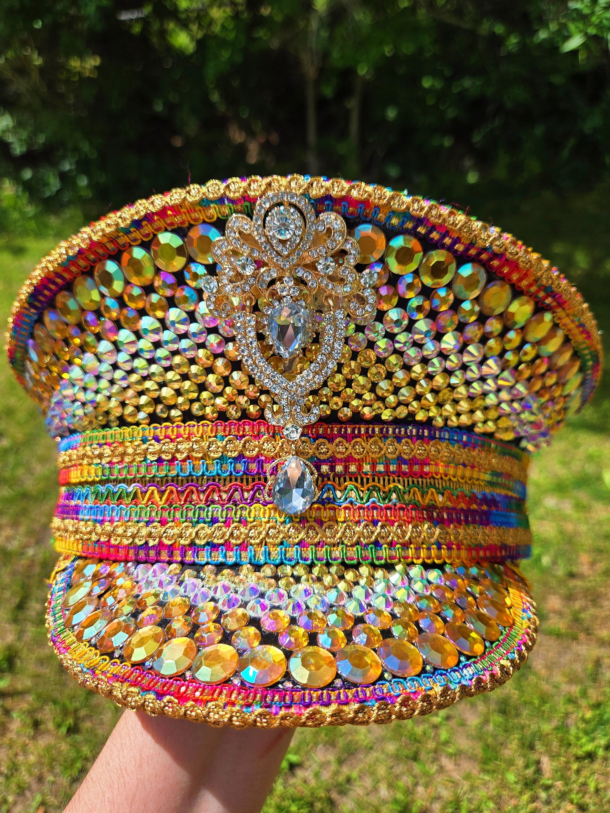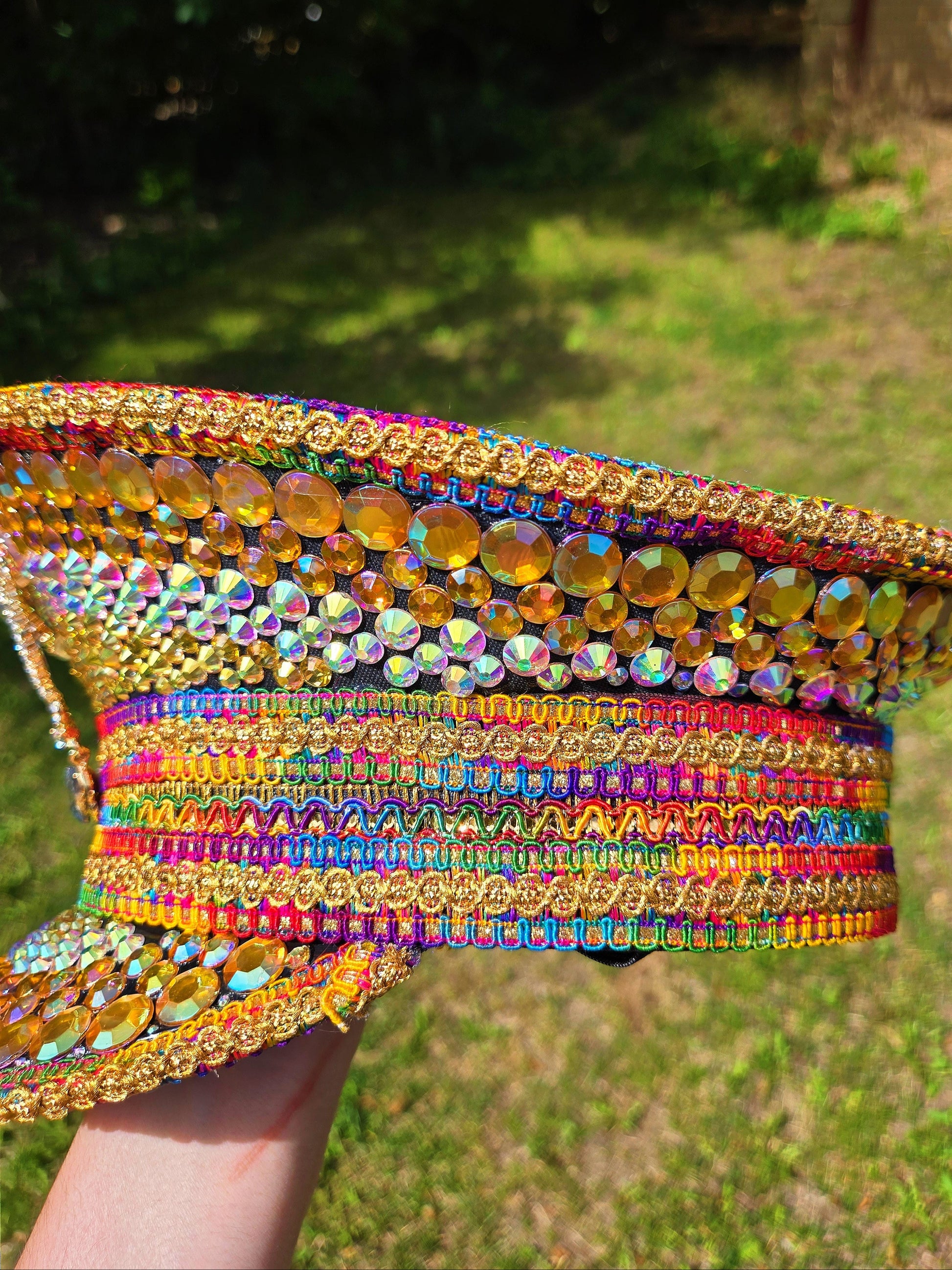 For those that want to make a statement, without making it *too* obvious. Featuring gold and iridescent crystals details, matching rainbow trims and sequin fabric top, and a gorgeous crystal centerpiece.