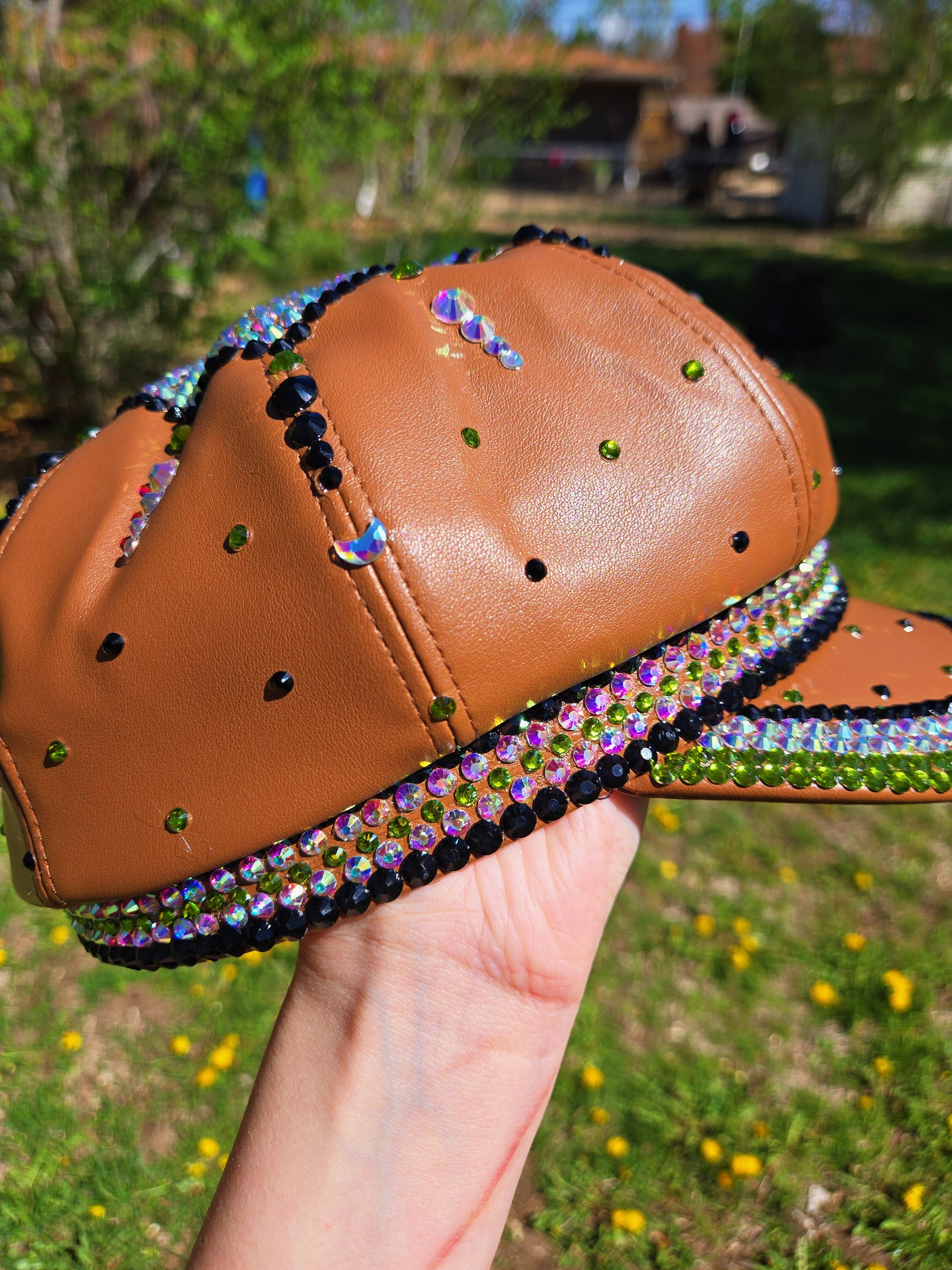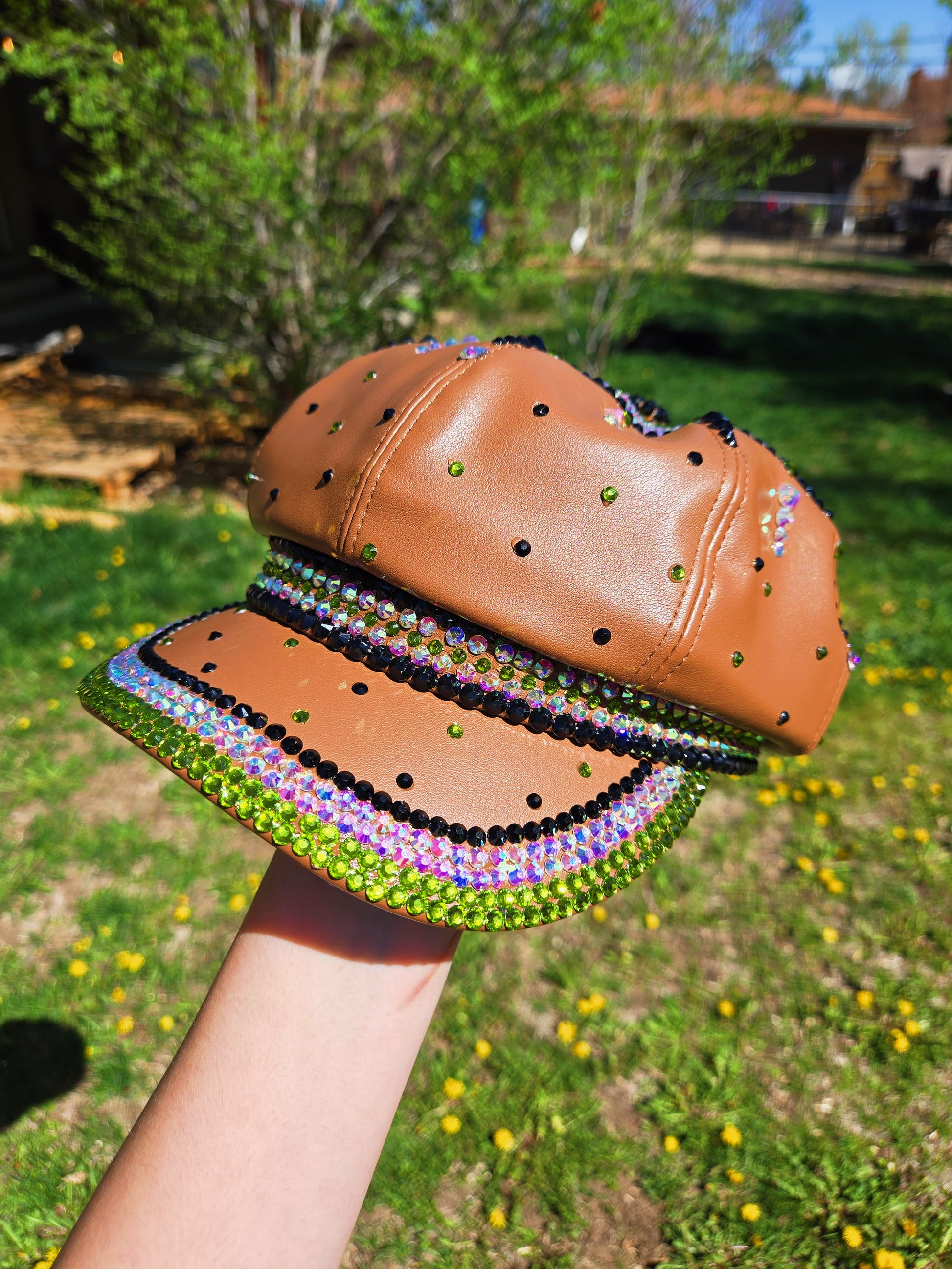You can pick both the base color of the hat as well as the accent color for the crystals for the hat (pictured here is the light brown hat with olive green accent color).