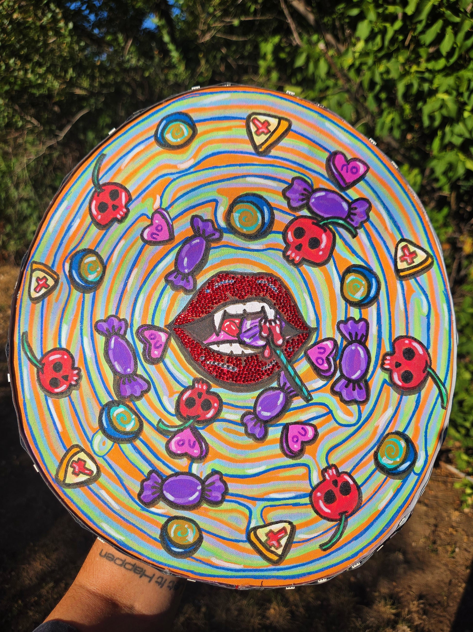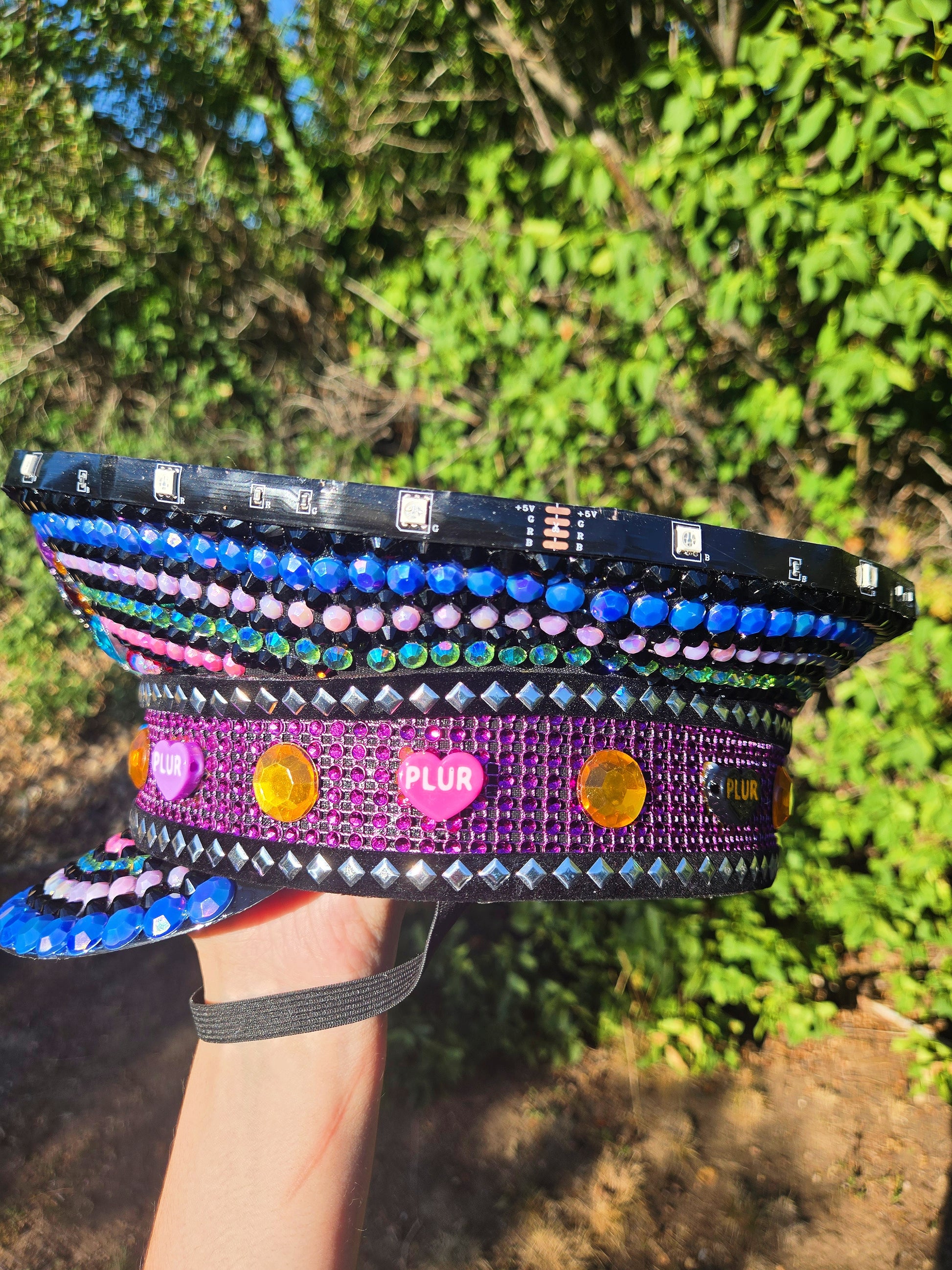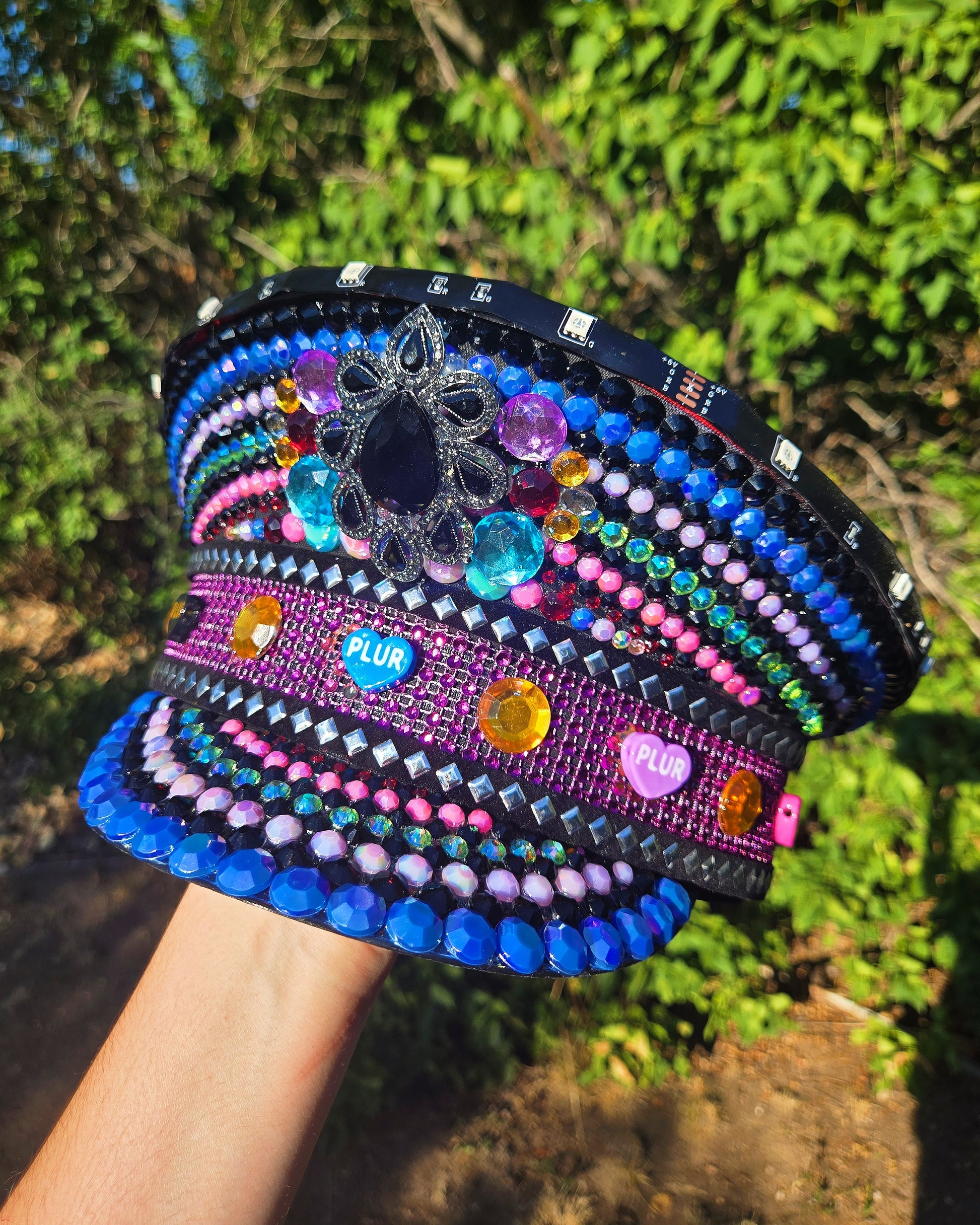 An INSANE double collab piece that is EXTRA special. Starting with the top, featuring a one of a kind painting done by Jenn Carroll (@deepleapfreezen). The remainder of the hat features super cute PLUR kandi beads by Bass Head Beads, and matching crystal details all over. Plus, we can't forget the LEDs around the top!