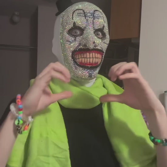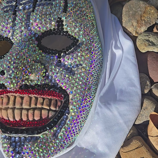 It's your favorite yassified serial killer clown. 🤡 Fully decked out in crystals done one at a time, this mask is sure to 🩸slay🩸 your next Halloween costume or rave look!